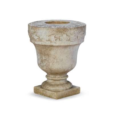 of inverted bell form, carved with a wide leaf and flower banded border, on a ring turned socle and square base