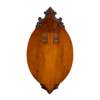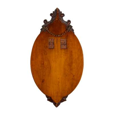 of oval form, the bevelled rim plates etched with foliate designs, surmounted with a scrolled crest, a further crest to the bottom