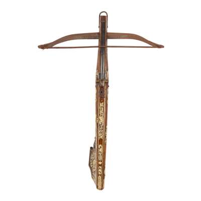 with heavy steel bow, small iron stirrup and string of twisted cord, fruitwood tiller swelling about the centre and shaped for the cheek with carved acanthus scroll, inlaid with ivory/bone/staghorn panels engraved with birds and foliate motifs, fitted with bone/staghorn flat/flight grove, an adjustable metal sight, steel bolt-clip, steel trigger with a spurred guard