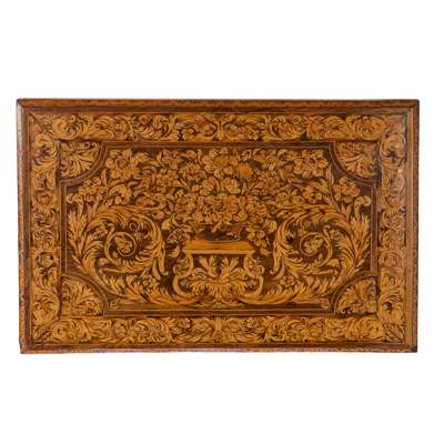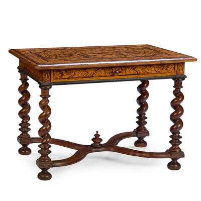 the top profusely inlaid with flowering basket marquetry within a wide scrolling foliate border, above a long frieze drawer, raised on spiral carved legs joined by a shaped X form stretcher centred by a turned finial and raised on bun feet