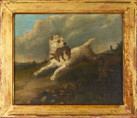 Signed and dated 1868, oil on canvas, depicting a terrier running with a hare between it's jaws, within a giltwood frame, indistinctly signed lower left ‘G. Earl 1868’, the frame with a faint inscription ‘The Poacher / George Earl’