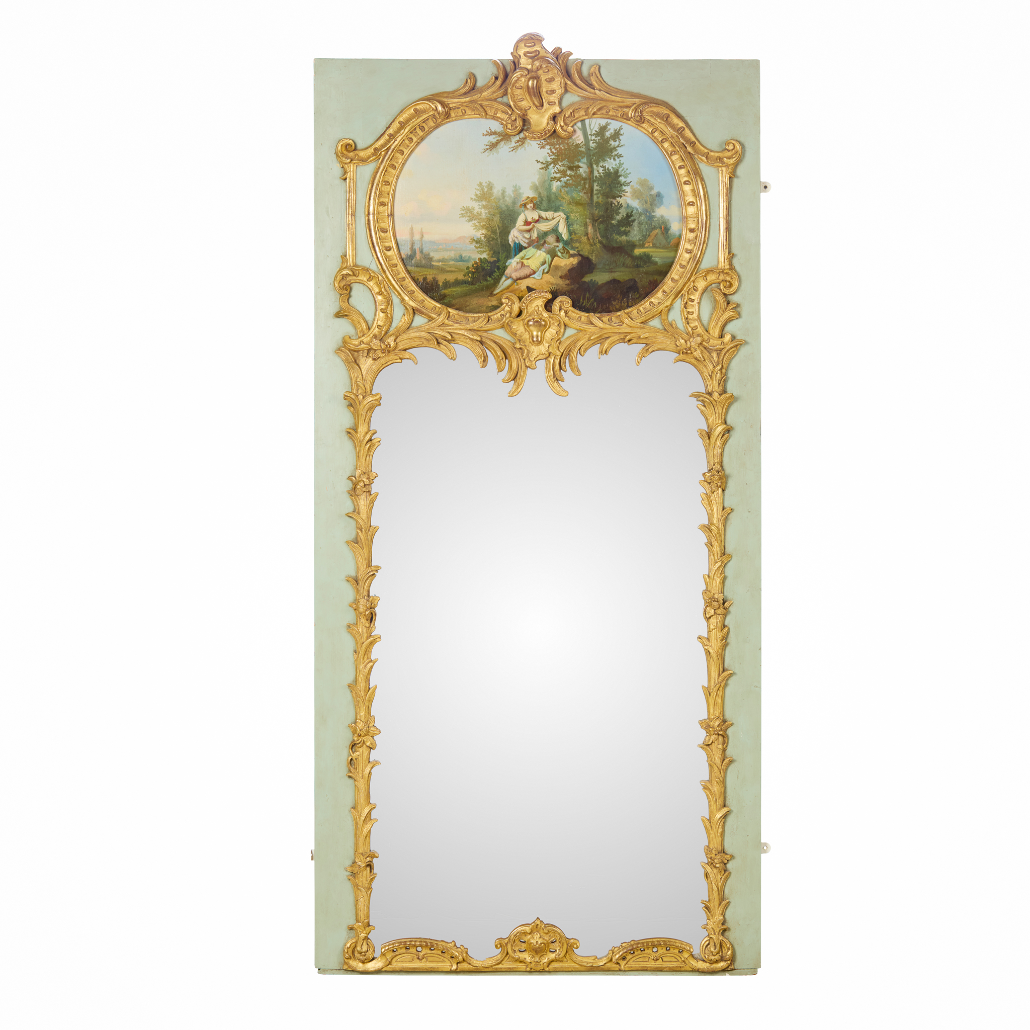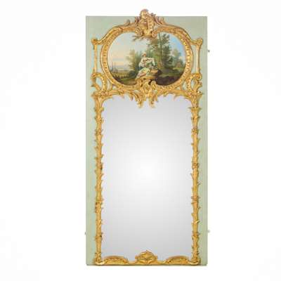 in the rococo style, with an oil on canvas panel after Boucher above a shaped mirror plate enclosed by a foliate rococo frame on a green painted ground