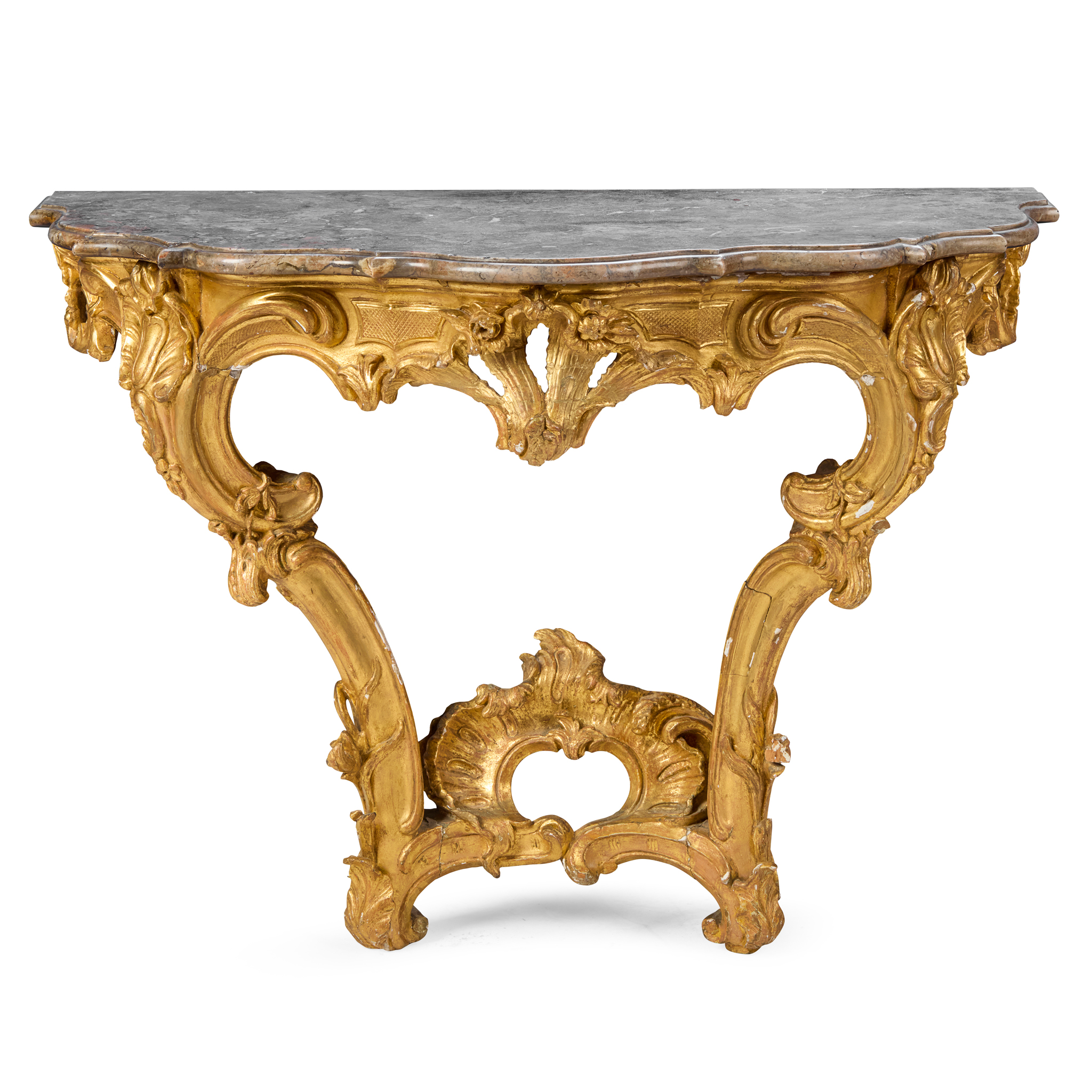 in the Rococo style, the serpentine variegated grey marble top with a moulded edge, on scrolling supports united by a scalloped and pierced stretcher
