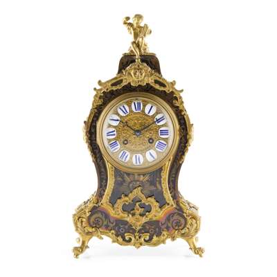 in the Louis XV style, the brass dial with white enamel Roman numerals cartouche plaques, the waisted case in tortoiseshell première partie Boulle, surmounted by a figure of a putto with brass mounts, raised on scroll bracket feet, the twin train movement with sun burst pendulum striking on a gong