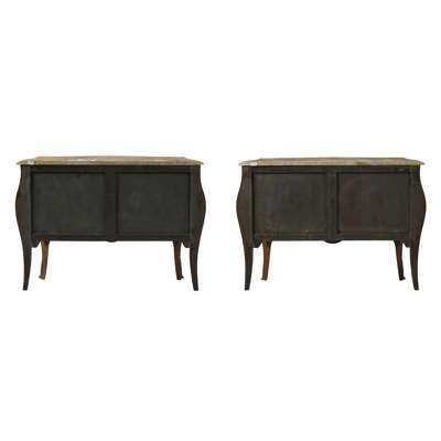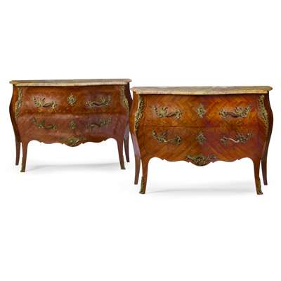 PAIR OF LOUIS XV STYLE KINGWOOD AND MARQUETRY MARBLE TOPPED COMMODES
