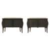 the serpentine yellow-pink marble tops with a moulded edge, above a pair of long drawers inlaid with floral marquetry and with rococo gilt metal mounts, raised on cabriole legs ending in sabots (2)