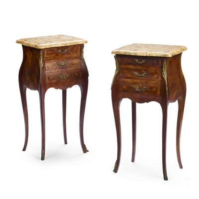 PAIR OF FRENCH KINGWOOD PARQUETRY AND MARQUETRY MARBLE TOPPED BEDSIDE TABLES