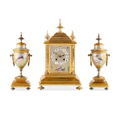 the porcelain dial with Arabic numerals, the architectural case with a stepped caddy top surmounted by five turned finials, the angles with silvered turned free columns, the ornithological porcelain panels with platinum-grounds in the manner of Narcisse Vivien, on a stepped base with silvered turned toupie feet, the twin train movement striking to a gong, with urn garnitures en suite (3)