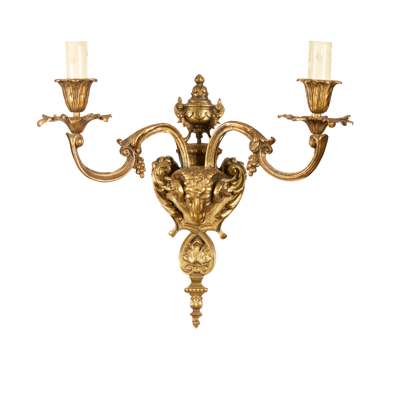 surmounted by urns and rams heads issuing two scrolling candle arms with acanthus nozzles and pans, fitted for electricity (2)
