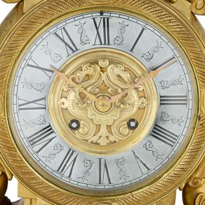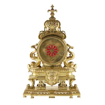 the silvered chapter ring dial with Roman numerals interspersed with engraved dolphins, the gilt bronze centre mask with embossed stylised crane figures, signed to the edges of the mask ‘E. Cornu, A Paris’, the architectural case with a pierced caddy top surmounted by a foliate finial, the case flanked by two cast and chased dolphin figures, on a shaped rectangular base centred by a lion mask raised on scroll corbels, further set on a stepped plinth with bracket feet, the twin train movement with outside countwheel striking to a bell, stamped ‘A.C’ in a circle and numbered ‘791’