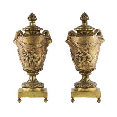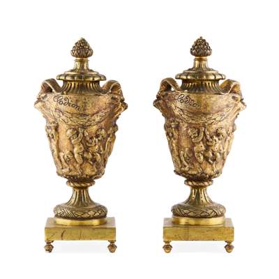 PAIR OF FRENCH GILT BRONZE URNS, AFTER CLODION