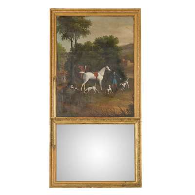 the rectangular mirror plate surmounted by an oil on canvas hunting scene, all in a moulded giltwood frame