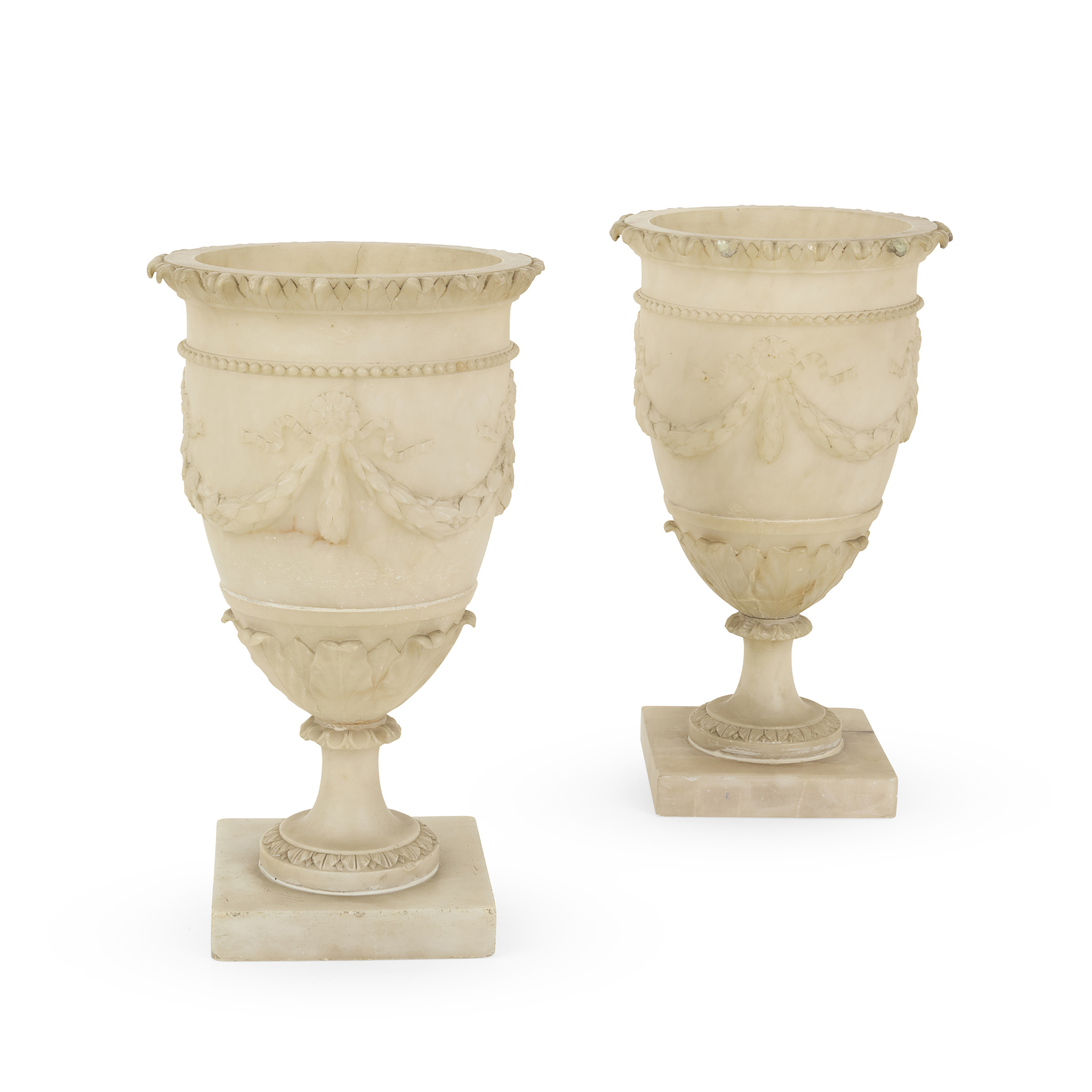 PAIR OF ITALIAN CARVED NEO-CLASSICAL ALABASTER URNS