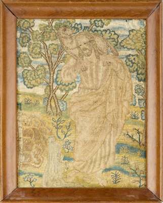 worked in long, short and tent stitches with green, blue, brown and yellow silks, the background with trees and flowers, in a later frame, 35.5cm high, 28cm wide (including frame); together with a 17TH CENTURY NEEDLEWORK FRAGMENT, depicting flowers, birds, and insects mounted on silk, in an ebonised frame (2)