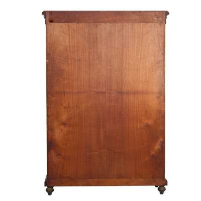 the bronze mounted cornice above a pair of glazed doors banded in bronze, opening to a glass shelf interior, flanked by angles with bronze chutes, raised on turned feet