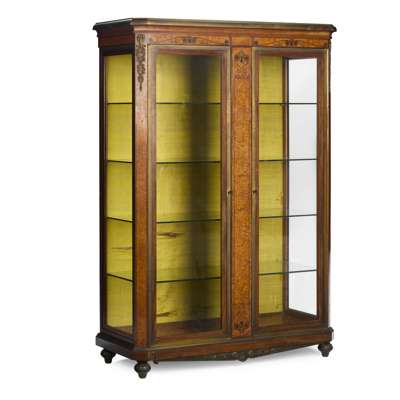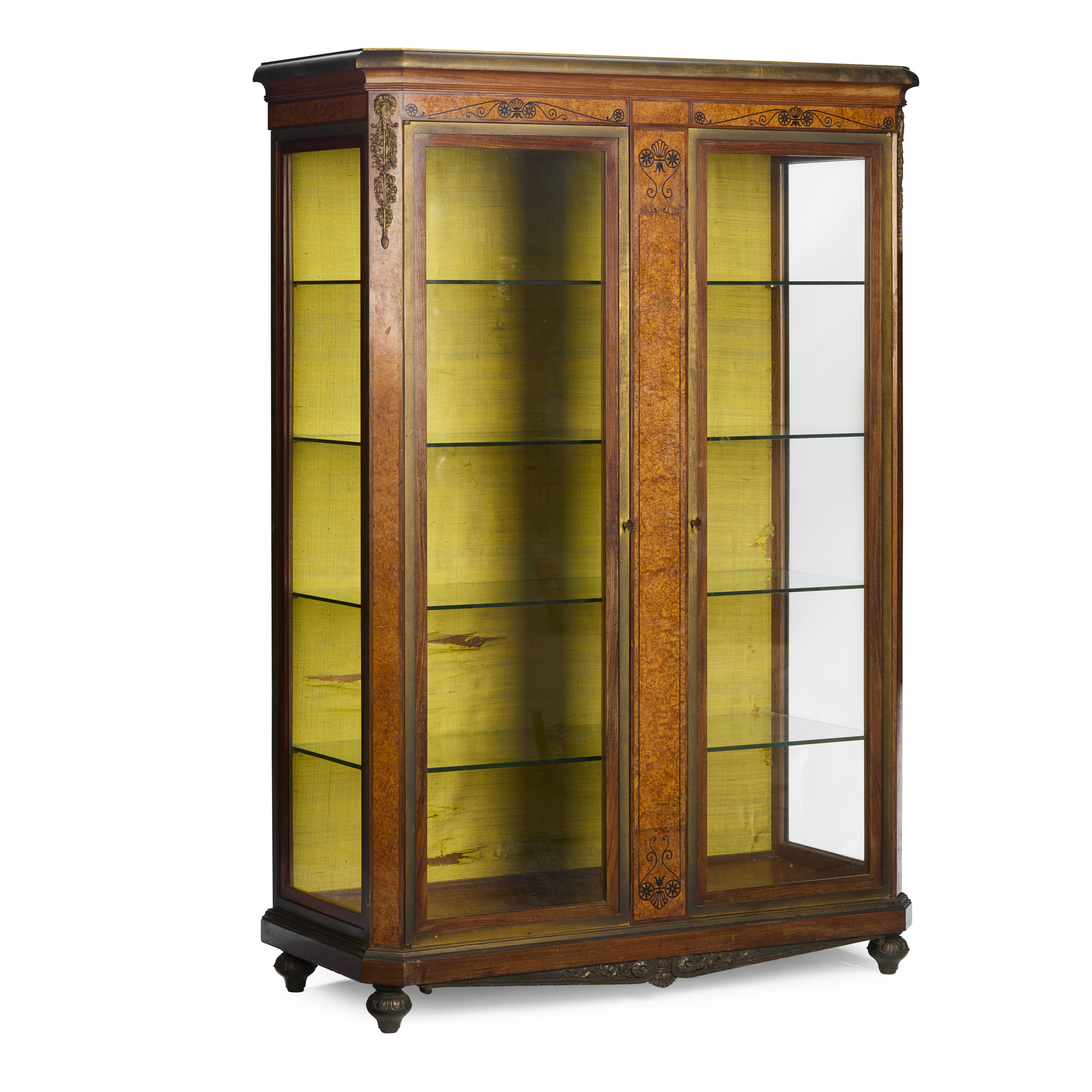 FRENCH AMBOYNA, MAHOGANY, AND EBONY INLAID BRONZE-MOUNTED DISPLAY CABINET