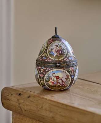 AUSTRIAN ENAMELLED PEAR-SHAPED BOX ENCLOSING A CLOCK
