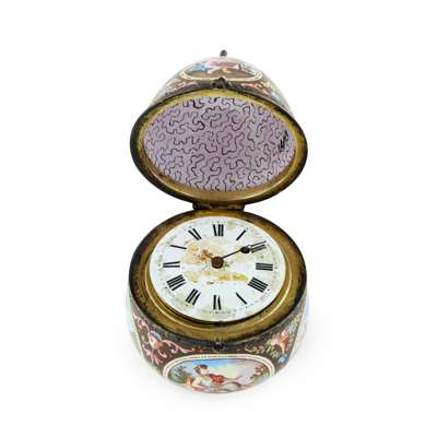 the case decorated with roundels painted with classical figurative scenes on a brown ground with mask, scroll and fruiting cornucopia designs, with gilt metal mounts and stalk, enclosing a clock with an enamel dial and Roman numerals, the dial inscribed ‘Roman Mally & Raux / N1231 / Constance’