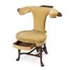 the curved armrest with swing-out drawers and a ratchet-adjusted platform, above a circular seat with a drawer to the seat rail, raised on tapered legs ending in pad feet and joined by turned stretchers, upholstered in yellow plush with fringe and close nail trim