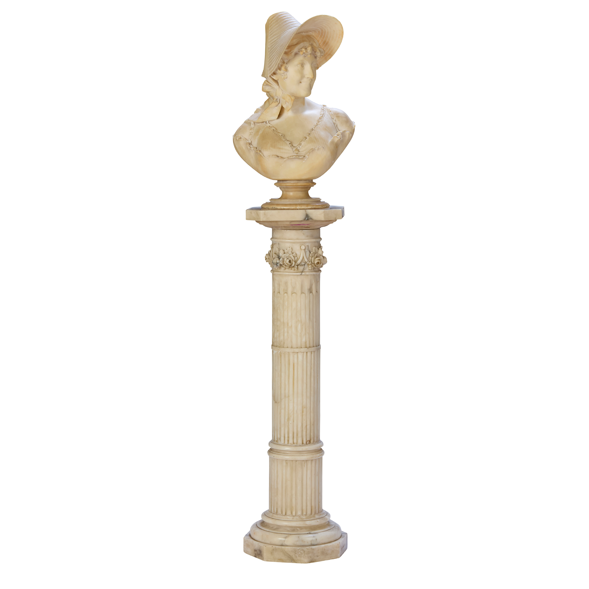 modelled smiling wearing a straw hat tied with a ribbon and a frilled chemise, on a socle base; on a carved alabaster pedestal column, with an octagonal platform top and base (2)