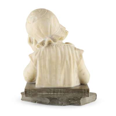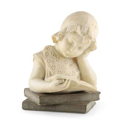 the girl seated wearing a frilled cap, studying her A B C from an open book, raised on a grey marble base carved as two books, unsigned