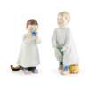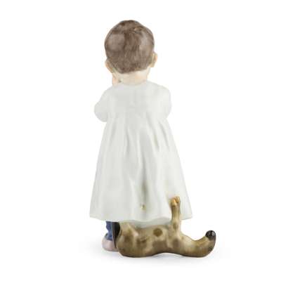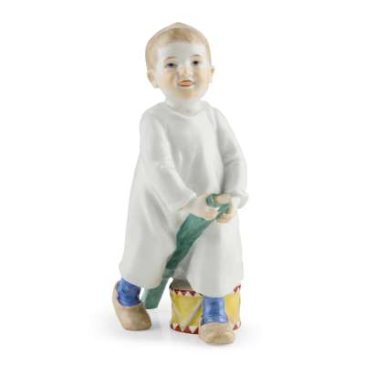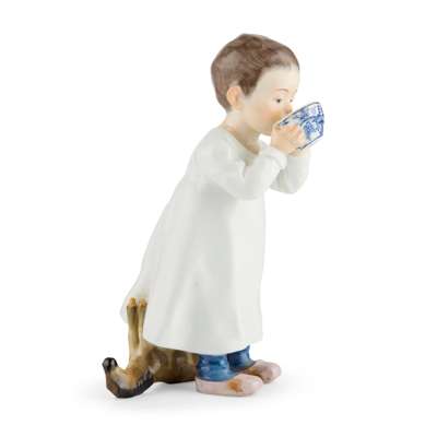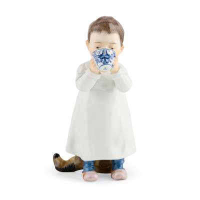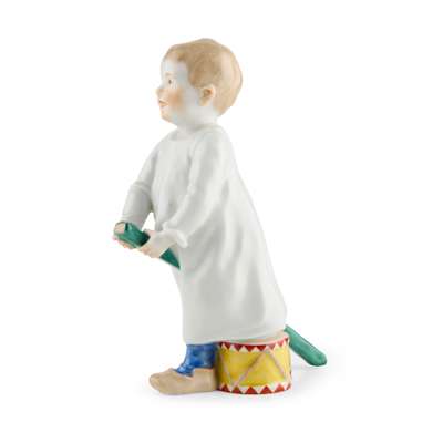 modelled by Konrad Hentschel, one sipping milk from an ‘Onion’ pattern teabowl, underglaze blue crossed swords mark, impressed W118 131, painters numeral 64; the other a boy astride a plank of green painted wood with a drum at his feet, underglaze blue crossed swords, impressed W119, painters numeral 7 (2)