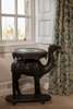 the octagonal top chip carved with elephants and floral motifs, raised on a plinth base with turned feet