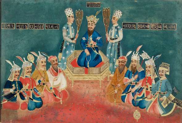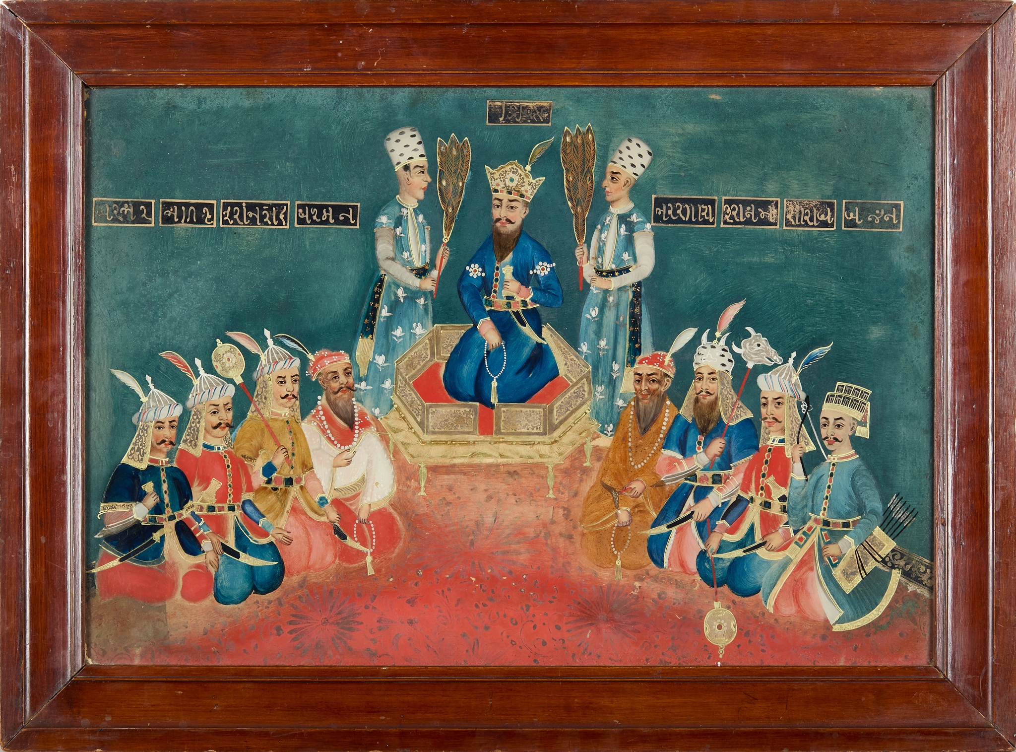probably depicting Maharaja Ranjit Singh, seated on a golden throne, holding a meeting with his sons and dignitaries, with inscriptions, within a stained wood frame