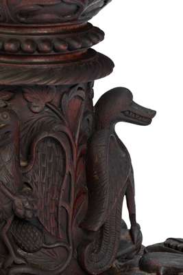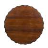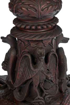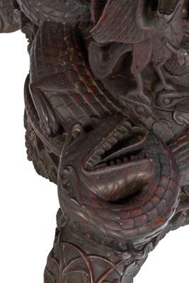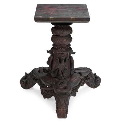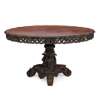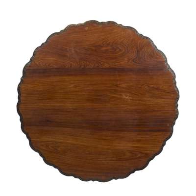 the shaped circular tilt top with a carved foliate border, above a pierced and carved foliate frieze, raised on a lotus and stork carved pedestal and triform base encircled by carved crocodiles, raised on foliate scroll feet