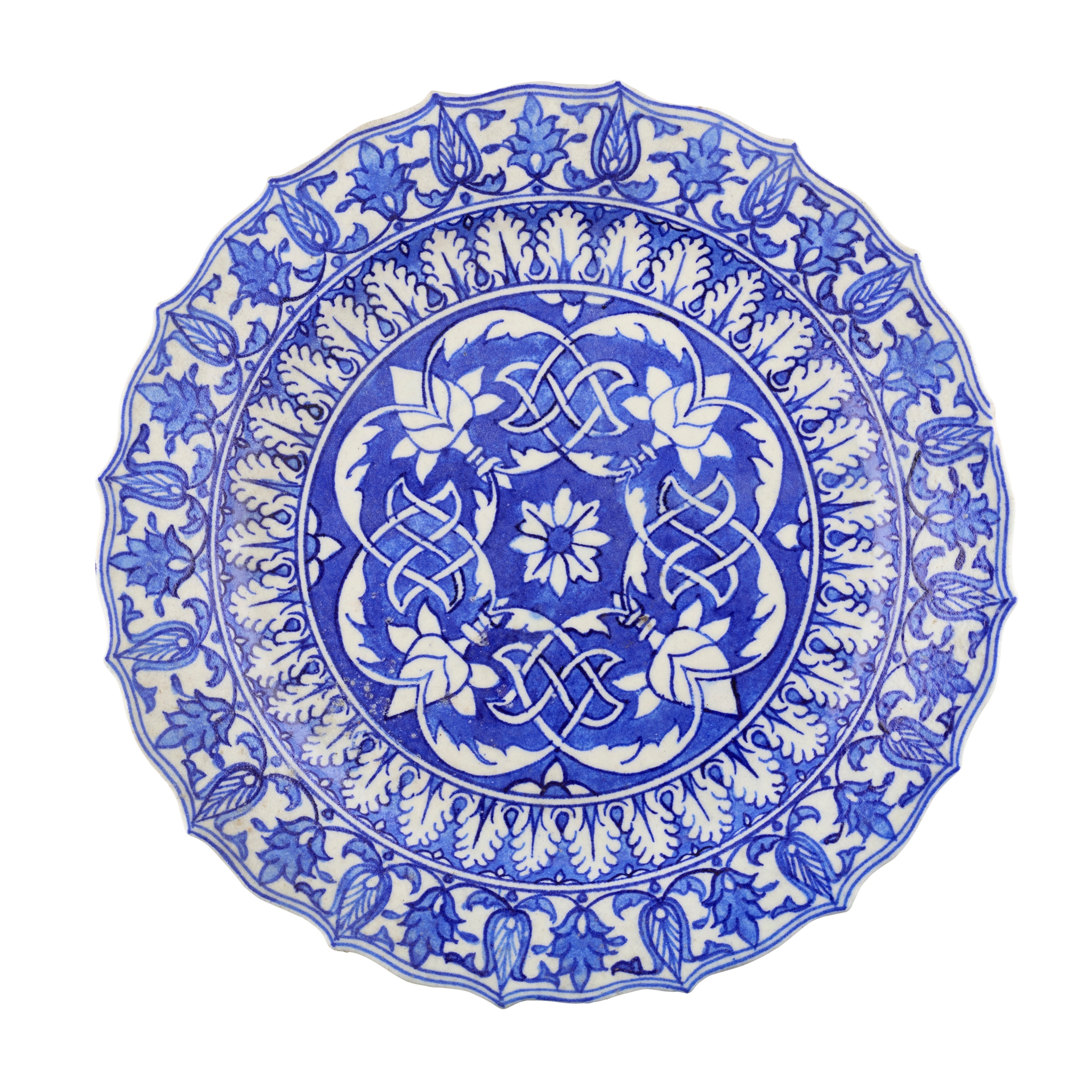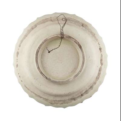 of circular form with a barbed rim, decorated with stylised foliate designs with stiff leaf borders