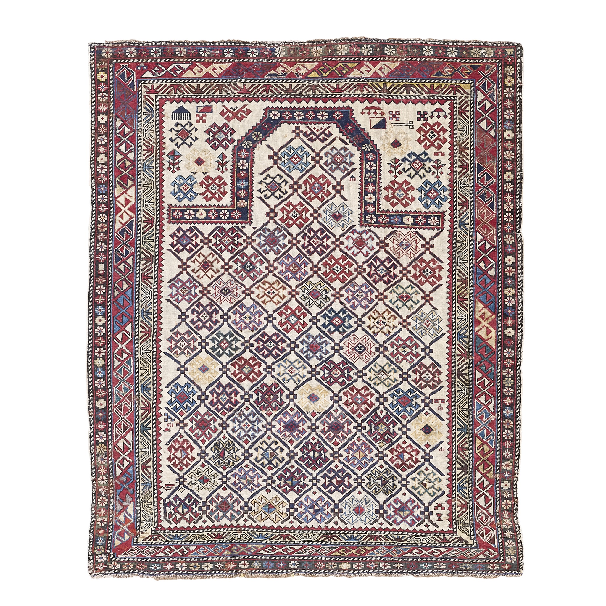 the ivory field with allover polychrome hooked lattice pattern, indigo mihrab bar, within narrow red border