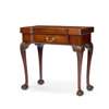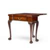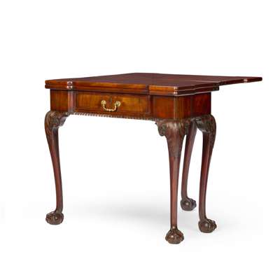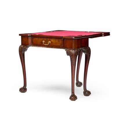 the top with outset square corners opening to a red baize lined playing surface with candle and game piece recesses, opening further to a further plain surface for tea, above a frieze drawer with gadrooned edge, raised on acanthus carved cabriole legs ending in claw and ball feet