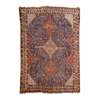the indigo field with three rust brown and ivory lozenge medallions, ivory spandrels, within ivory border