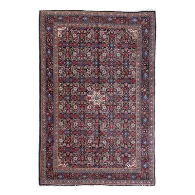 the indigo field with small ivory medallion and allover herati pattern, within red border