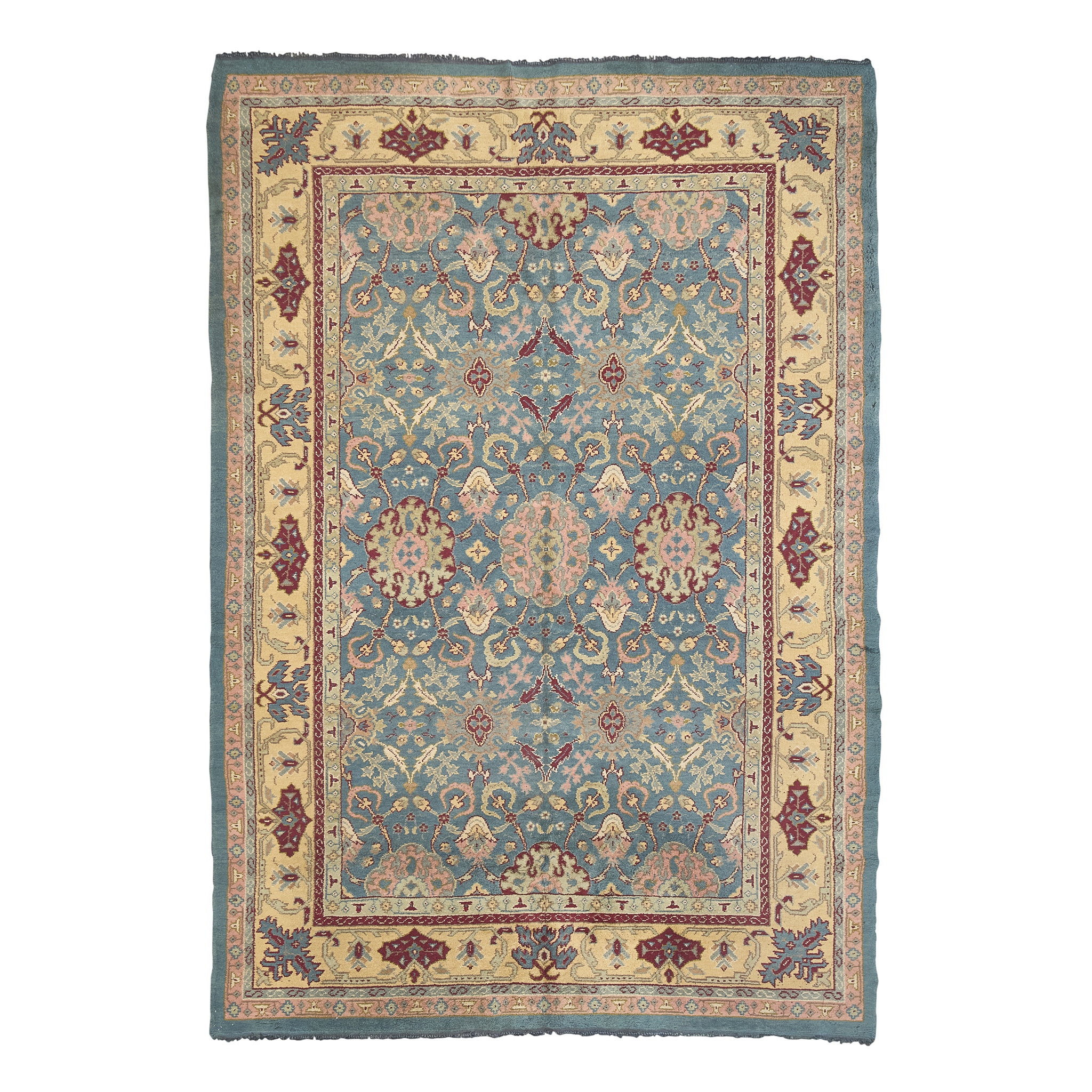 the blue field with small pink medallion and allover foliate pattern, within yellow border