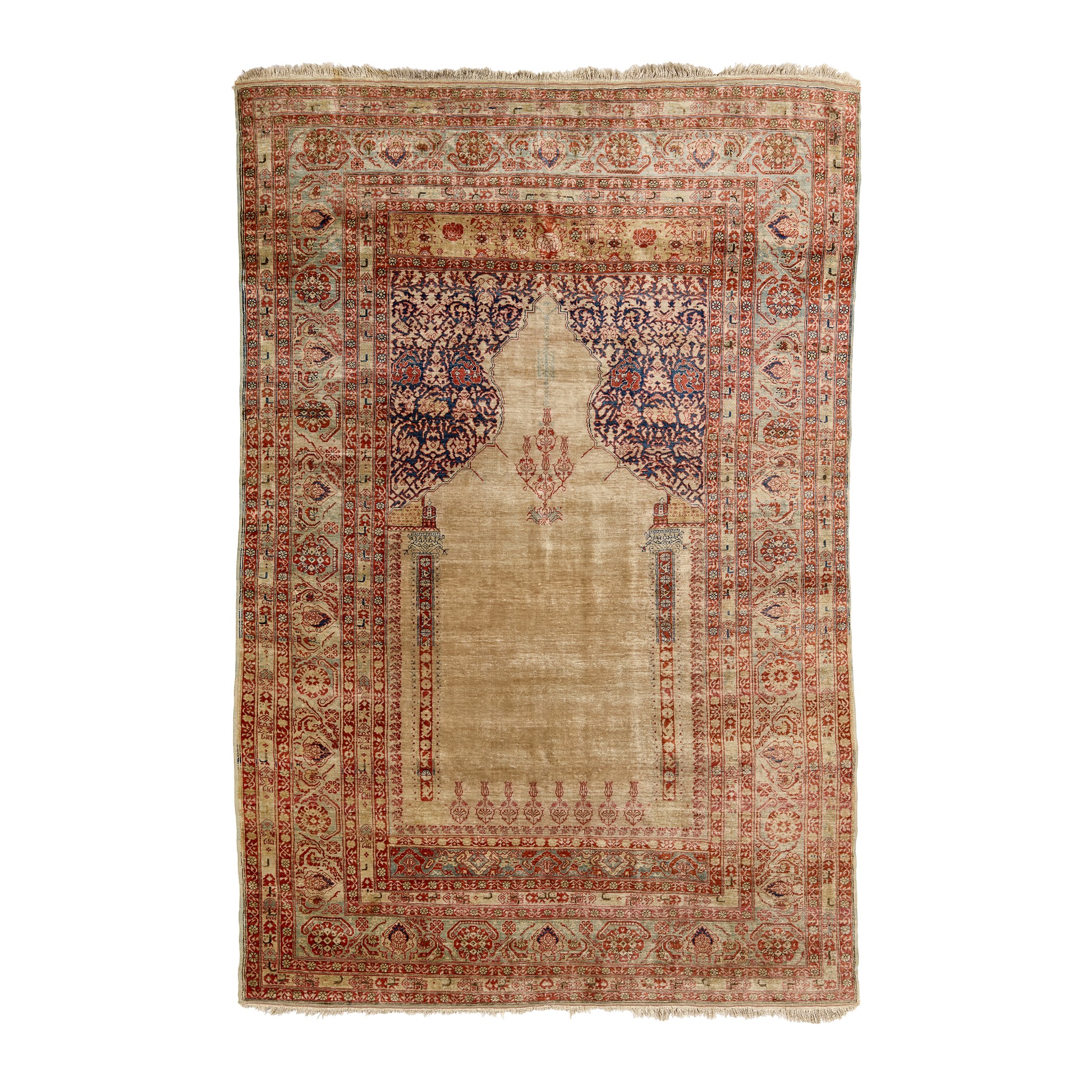 the plain camel field with columns and indigo mihrab spandrels, within light blue border