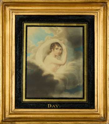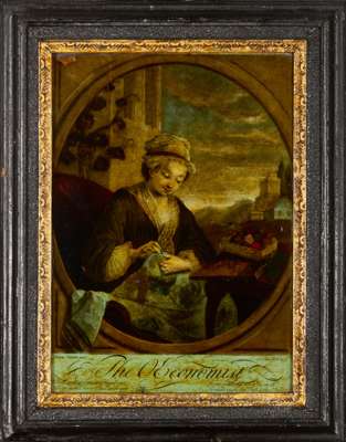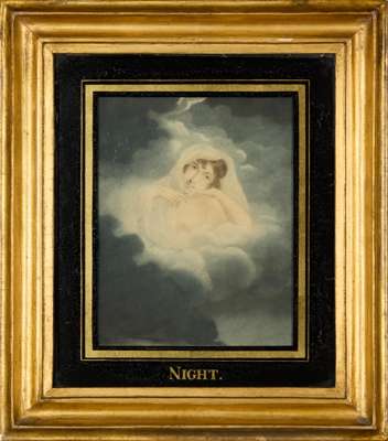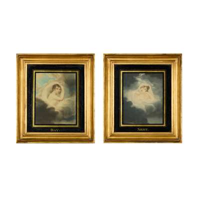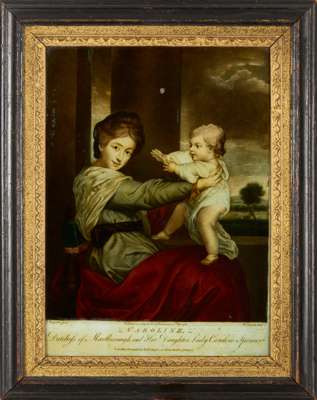 to include a portrait of ‘Caroline, Duchess of Marlborough and her daughter Lady Caroline Spencer', after Reynolds; ‘The Economist’, after Etienne Jeaurat, both in moulded ebonised frames with giltwood and gesso slips; a portrait of George III, after Thomas Frye, in a stained wood frame, 56cm high, 41cm wide; a view of classical architecture and ruins and figures at leisure, within an ebonised moulded frame, 43cm high, 53cm wide; together with TWO FRAMED MEZZOTINT PRINTS DEPICTING ‘NIGHT’ AND ‘DAY’, after Harper, in verre églomisé black and gilt mounts and moulded giltwood frames, 33.3cm high, 29.2cm wide (6)