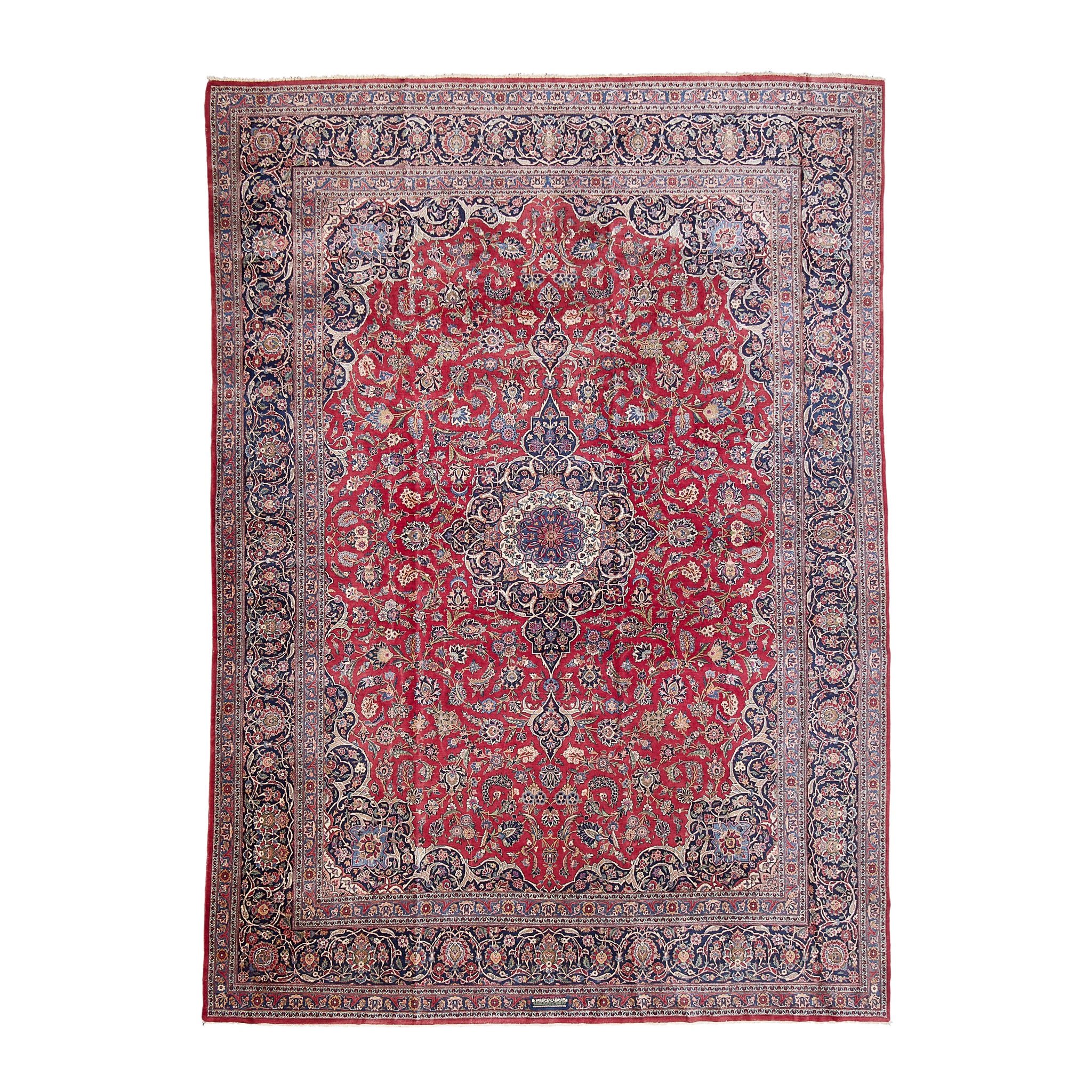 the crimson red field with indigo and ivory medallion, similar spandrels, within indigo border, inscription for ‘Hassan Farshchi & Sons’ to one end