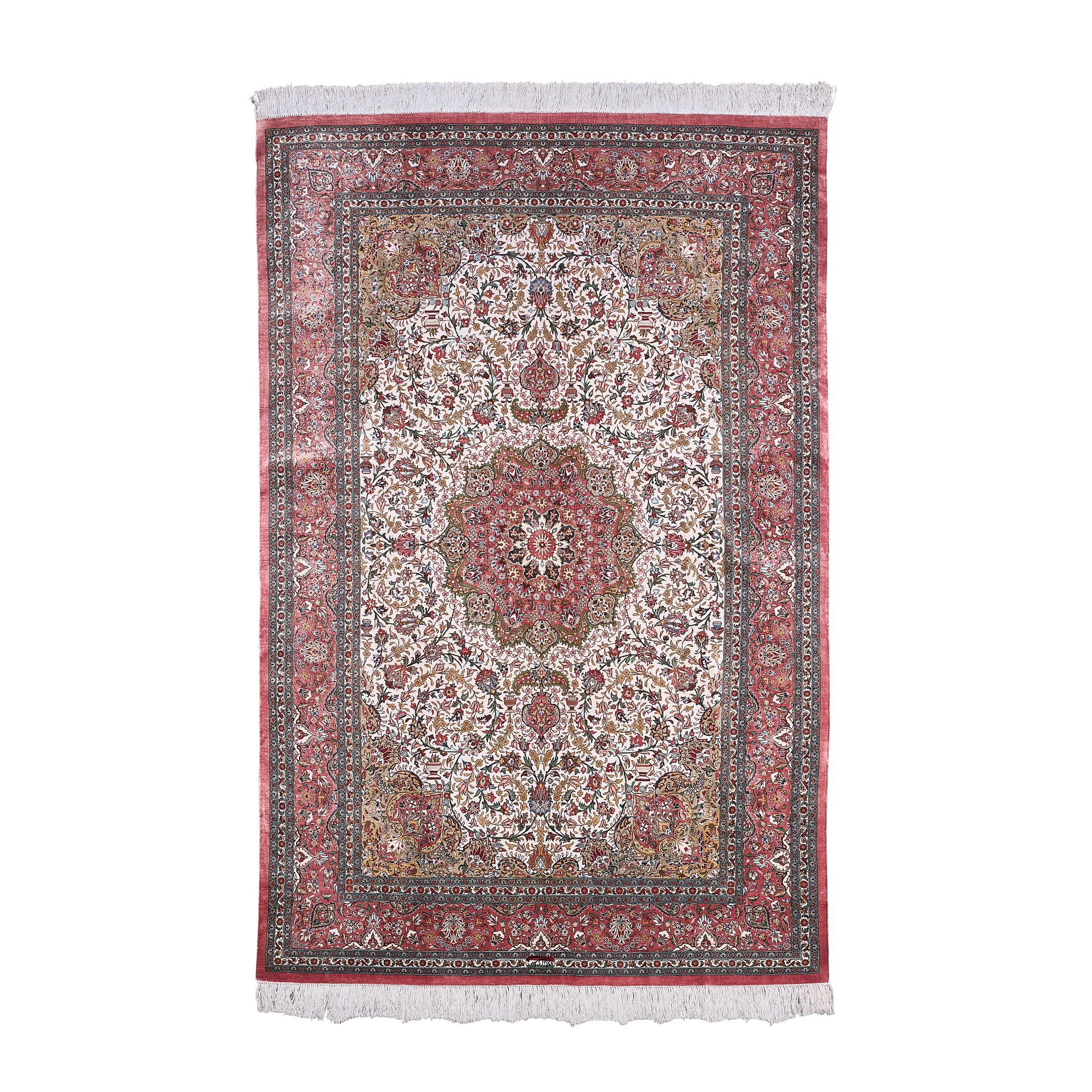 the ivory field with rose pink medallion, olive spandrels, within pink border