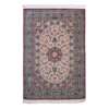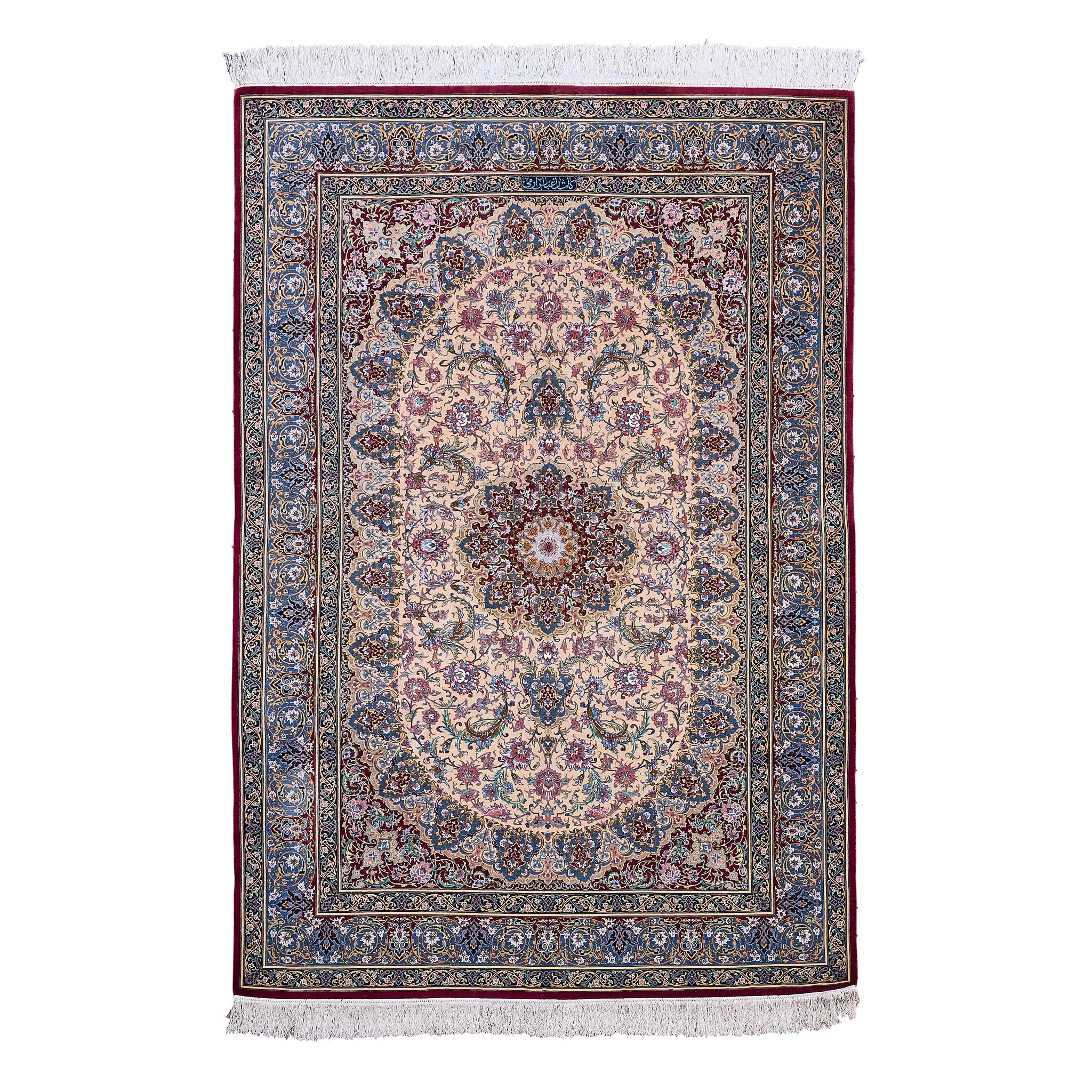 the light brown field with crimson red and blue medallion, similar outer band and spandrels, within red and blue border, inscription to one end