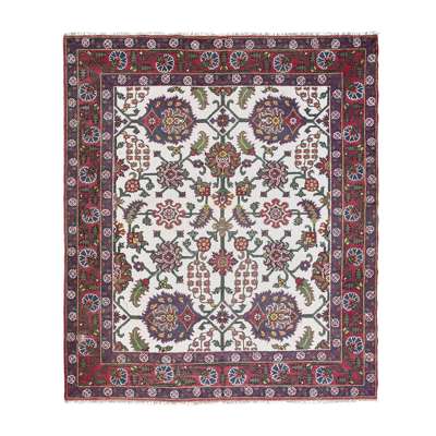 the ivory field with allover palmette and foliate vine pattern, within red border