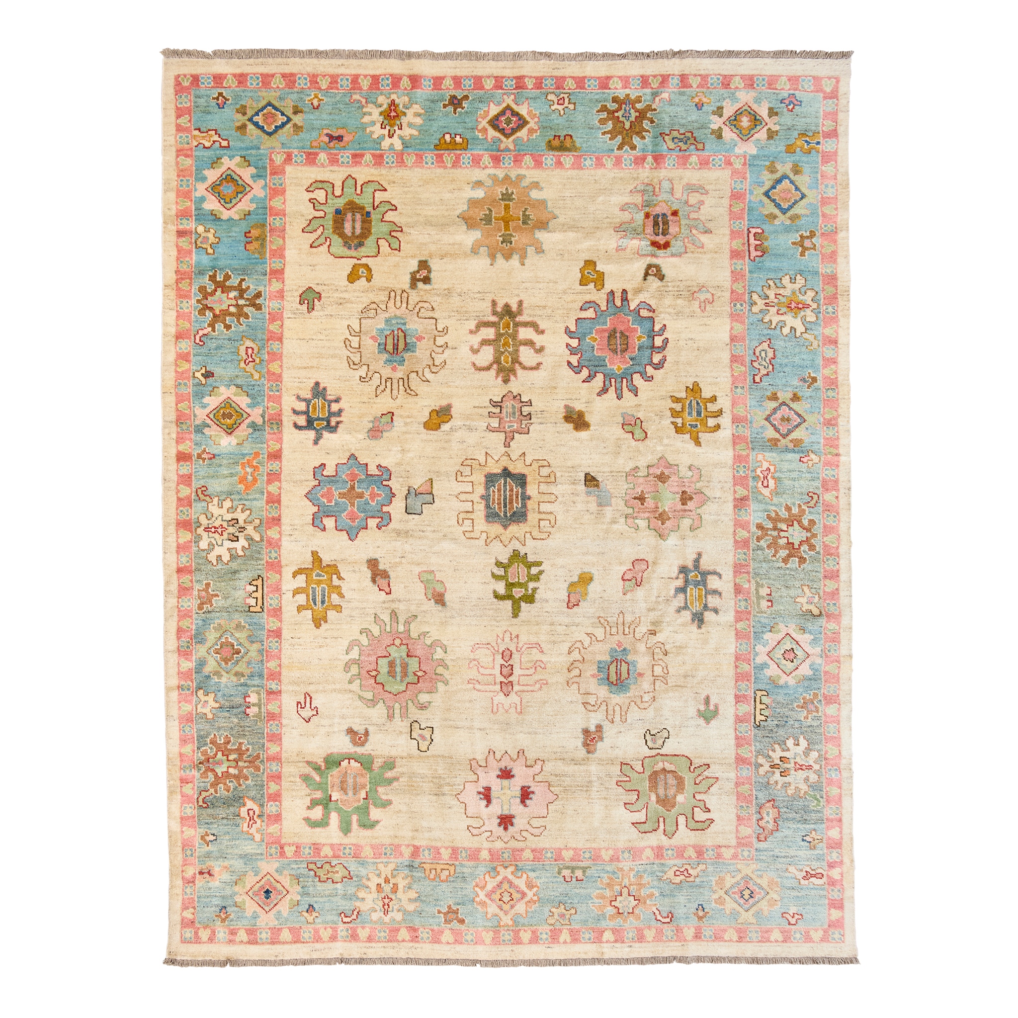 the cream field with allover stylised palmette pattern, within light blue border