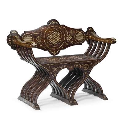 ITALIAN BONE INLAID WALNUT DOUBLE SEAT SAVONAROLA CHAIR