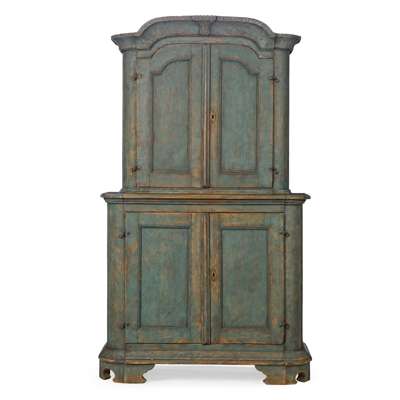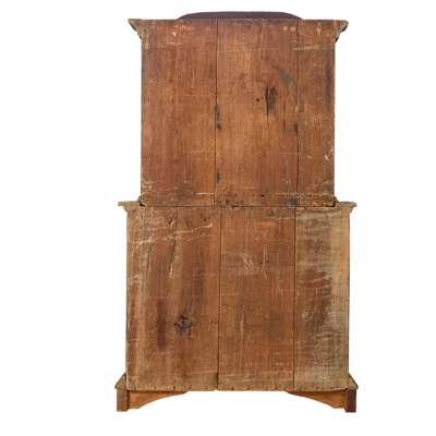 the arched cornice above a pair of moulded panel doors enclosing shelves, drawers, and a spoon rack; the lower part with a shelved interior, raised on bracket feet