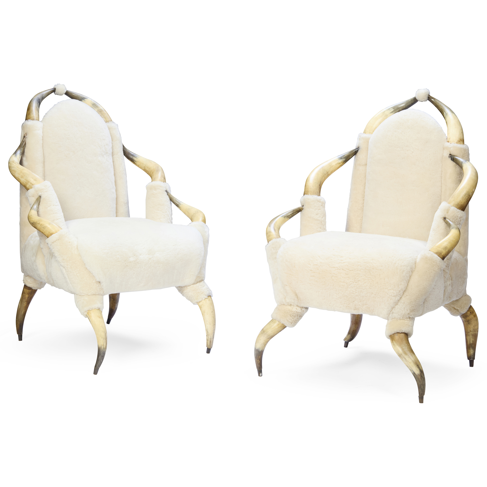 the padded backs above stuff-over seats, newly covered in cream shearling, the frames made from blonde cow horns (2)