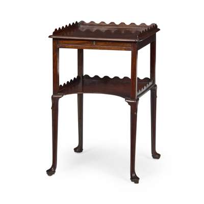 the square top with a wavy gallery and moulded edge with re-entrant corners, above a concave lower tier with matching gallery, raised on slender tapered legs ending in pad feet