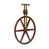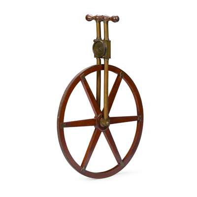 the 35.5in. diameter wheel bound in iron, with six spokes and brass hub and fork assembly leading to a turned cross handle and 4.5in brass dial with concentric gauge markings for miles, inscribed ELLIOTT BROS THE STRAND LONDON