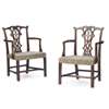 the shaped top rails with scrolled terminals above pierced and interlaced splats, over wide stuff-over seats with serpentine fronts, raised on channel moulded straight chamfered legs joined by H stretchers; to include six side chairs and a pair of armchairs (8)