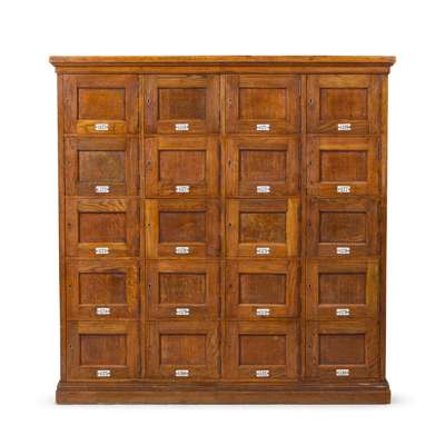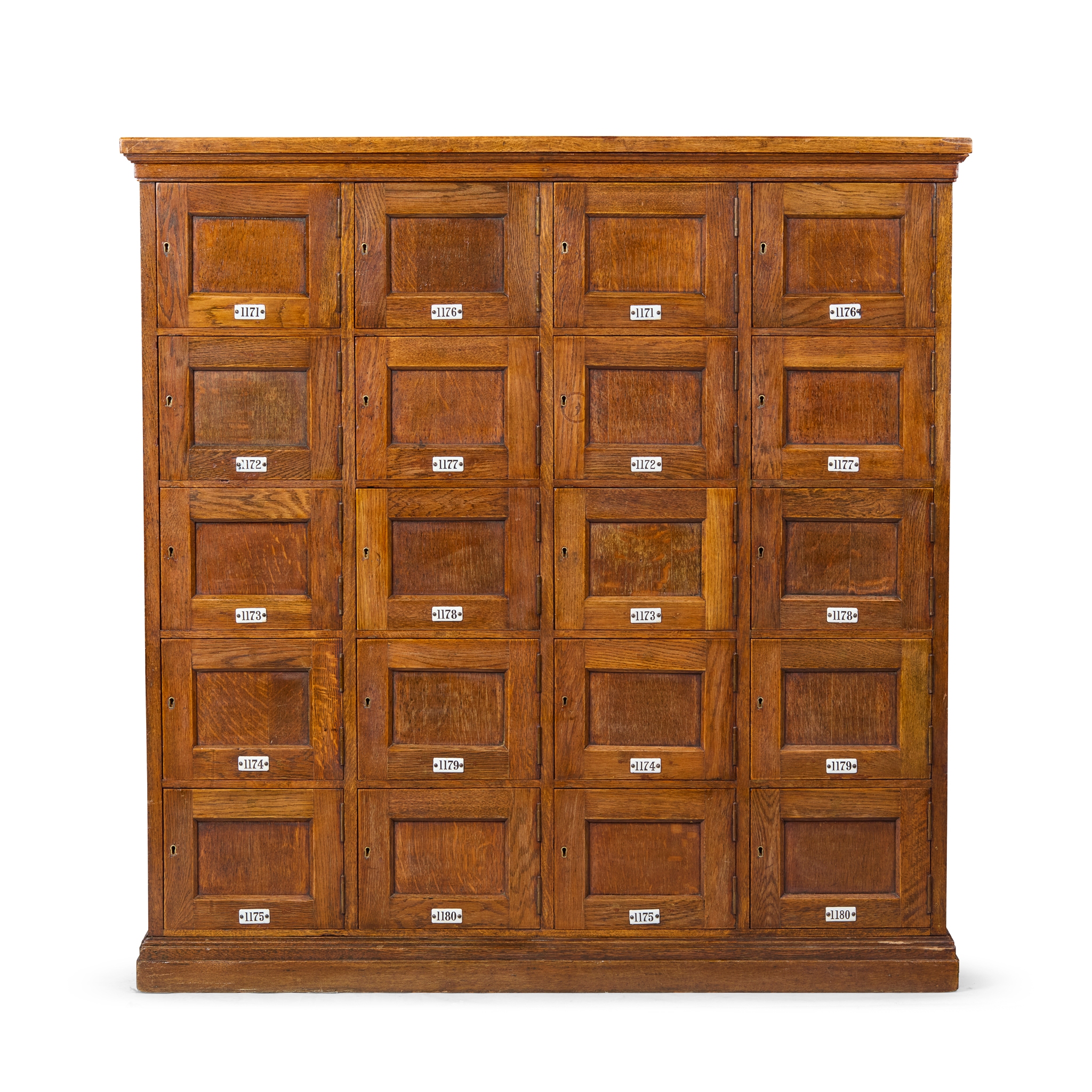 the moulded cornice above an arrangement of twenty panelled locker doors fixed with enamel number plates, on a moulded plinth base