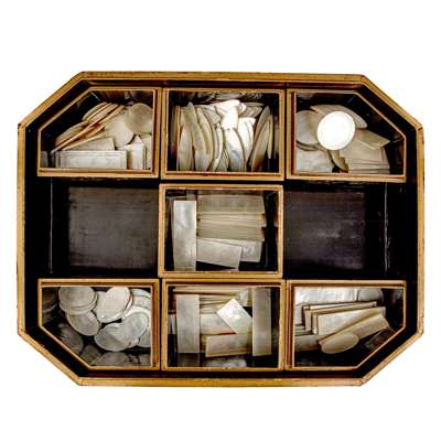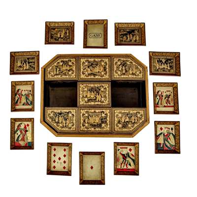 the octagonal box with a lift-off cover all decorated in gilt with Chinoiserie and intricate floral motifs, opening to an arrangement of covered gaming boxes and card trays, decorated with diamond suit face cards, and a large quantity of mother-of-pearl game markers